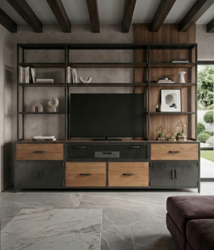 - Une conception 100 % personnalisée : Nous ne bricolons pas avec des modules standards. Votre meuble TV industriel est dessiné sur mesure (hauteur, largeur, profondeur) pour s’intégrer au millimètre près dans votre espace, tout en respectant votre propre rythme d’agencement.