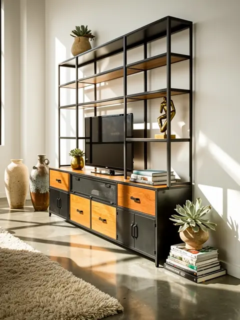 Agencement intelligent du meuble TV industriel avec rangements en bois massif