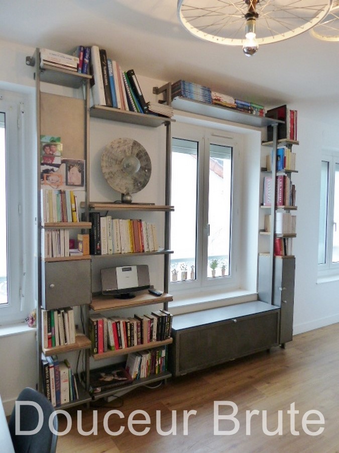 Douceur Brute crée et réalise pour vous la bibliothèque modulaire « LILAS », une solution de rangement élégante et adaptable à vos besoins. Conçue avec des montants robustes en métal patiné, elle peut être fixée au mur ou au plafond et personnalisée avec diverses configurations d’étagères, de coffres et de cubes de rangement. Cette bibliothèque contemporaine est entièrement fabriquée en France.