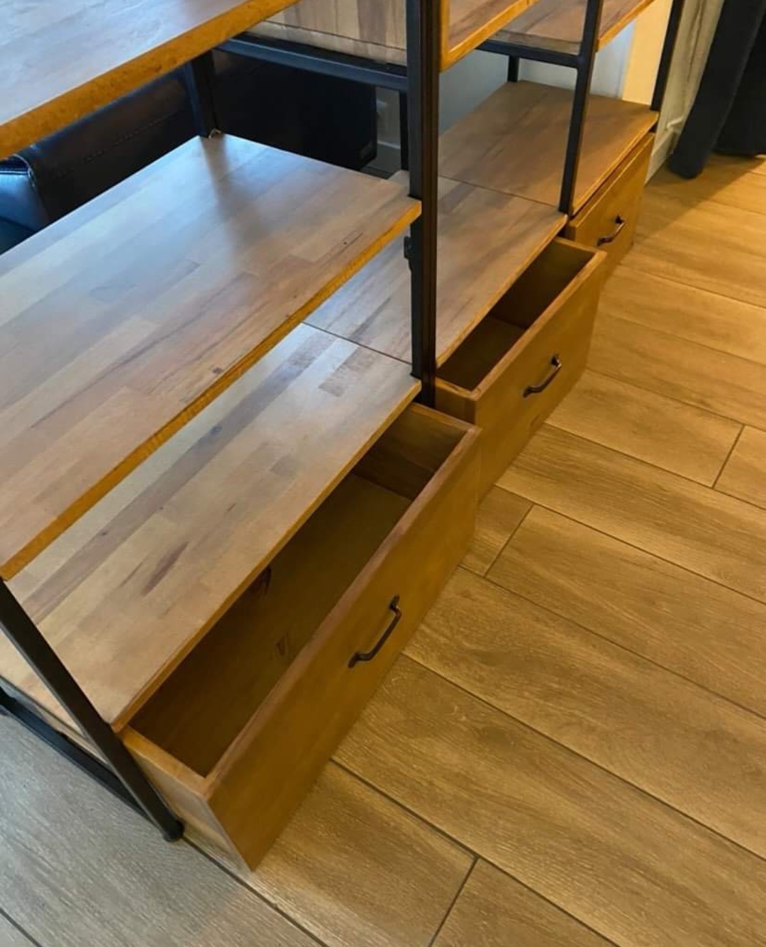 3-Optimiser le rangement sans encombrer : Grâce à ses coffres sur roulettes en partie basse, vous camouflez le nécessaire du quotidien (lingerie de table, dossiers, câbles) pour ne laisser apparaître que l’essentiel et le beau sur les étagères.