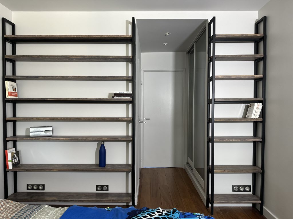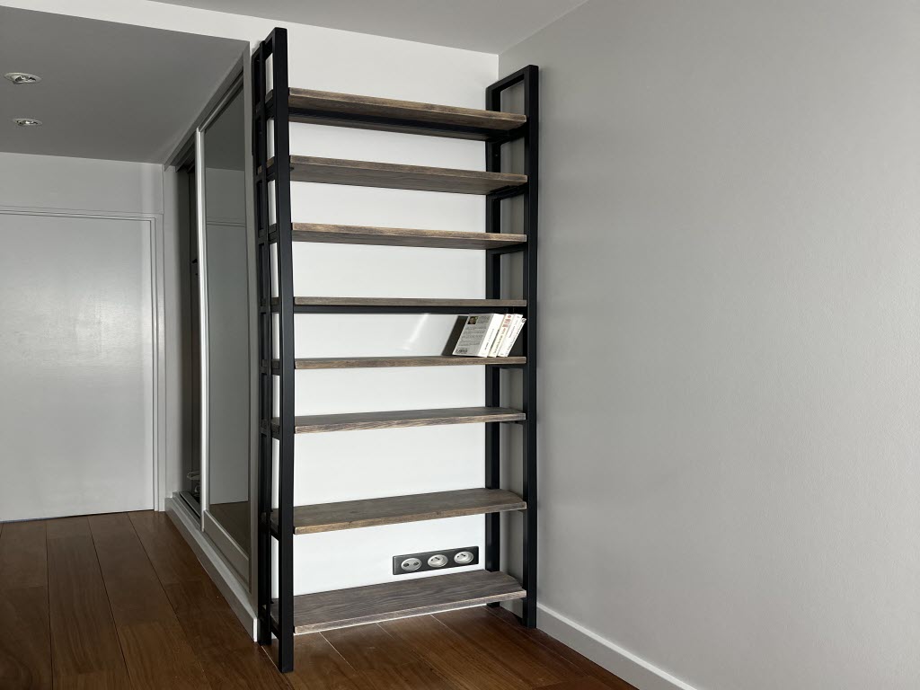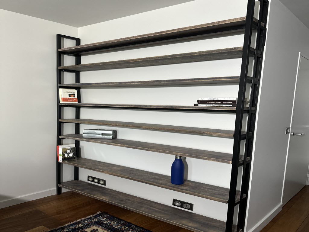 Découvrez la bibliothèque industrielle « JEROME », une pièce unique et sur mesure conçue pour allier fonctionnalité et esthétique. Fabriquée à partir de chêne massif vieilli et d’acier laqué noir mat, cette bibliothèque offre une profondeur de 20 cm et une hauteur de 230 cm, idéale pour une chambre avec un espace limité.