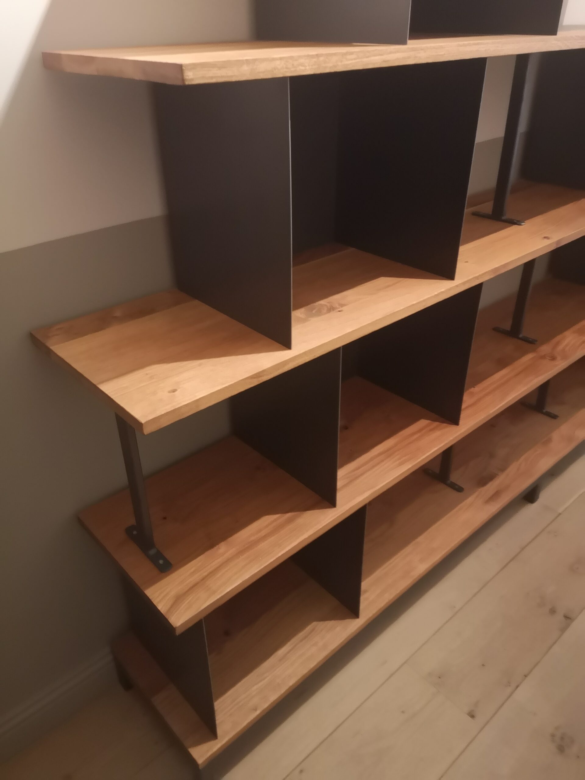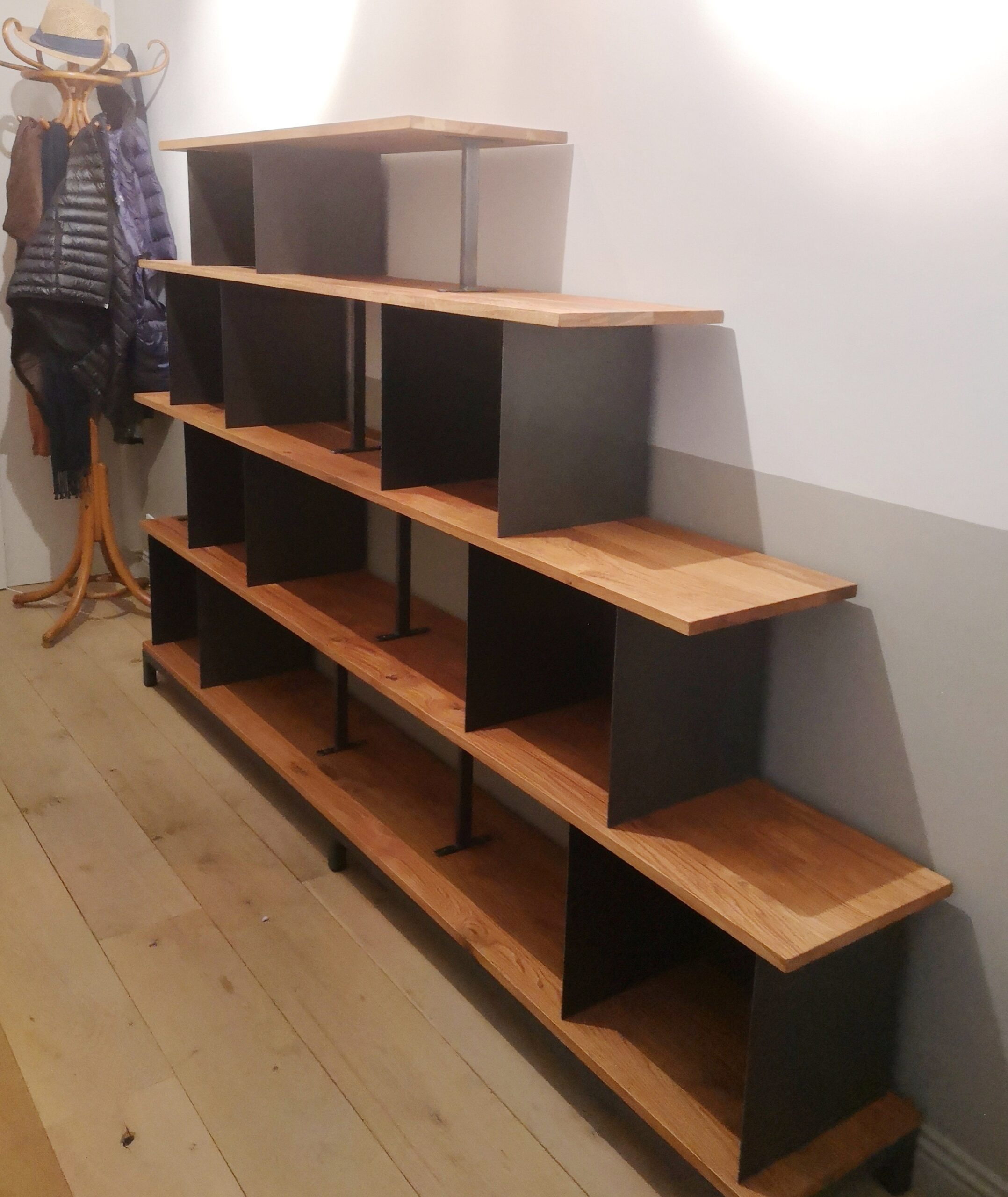 Composé de 6 niches en métal de L 38 x p 30 x hauteur 34 cm et 1 niche de L 38 x p 30 x hauteur 26 cm et 5 étagères en chêne massif de différentes longueur- Socle, Niches & béquilles en acier brut huilé