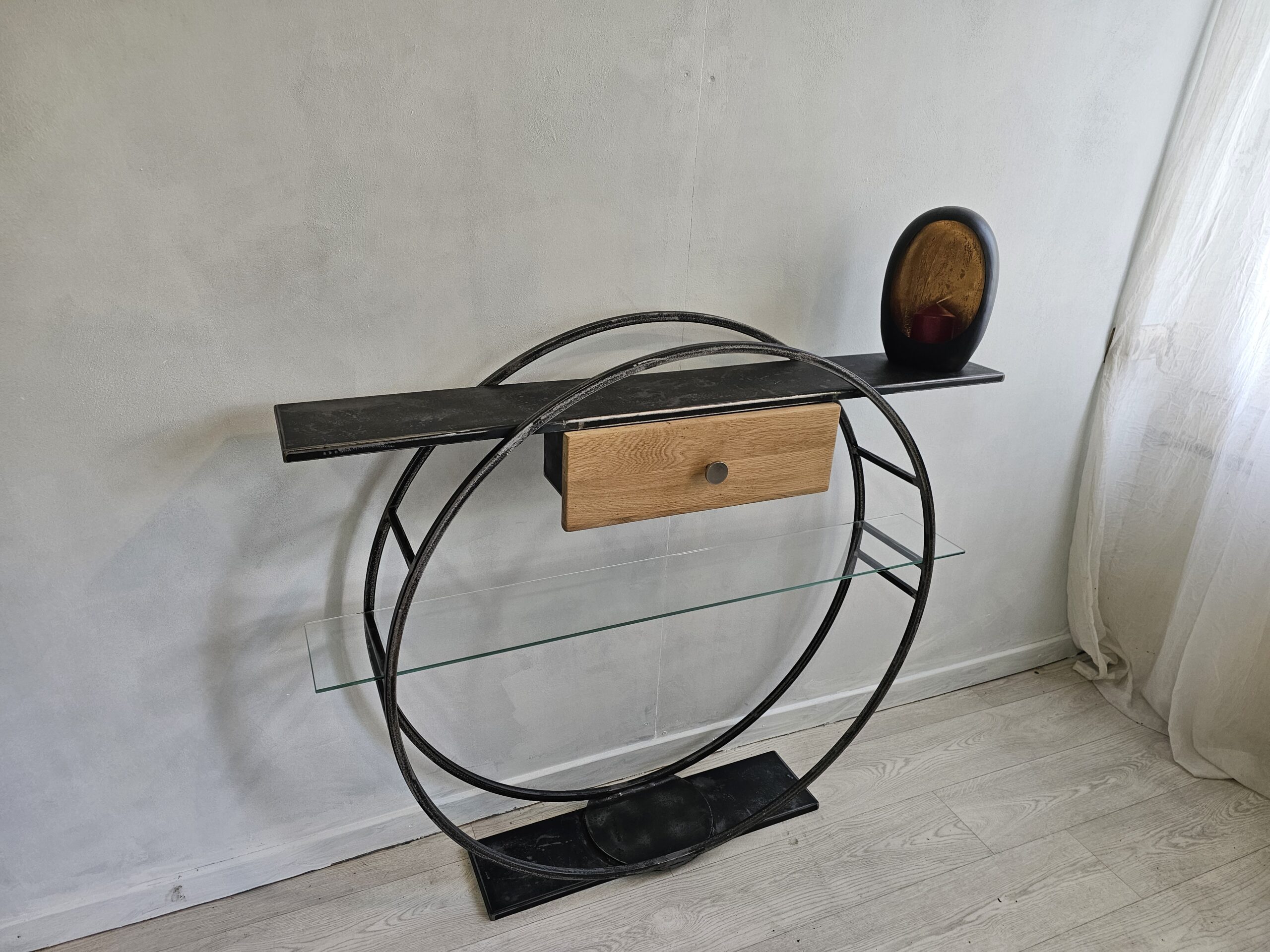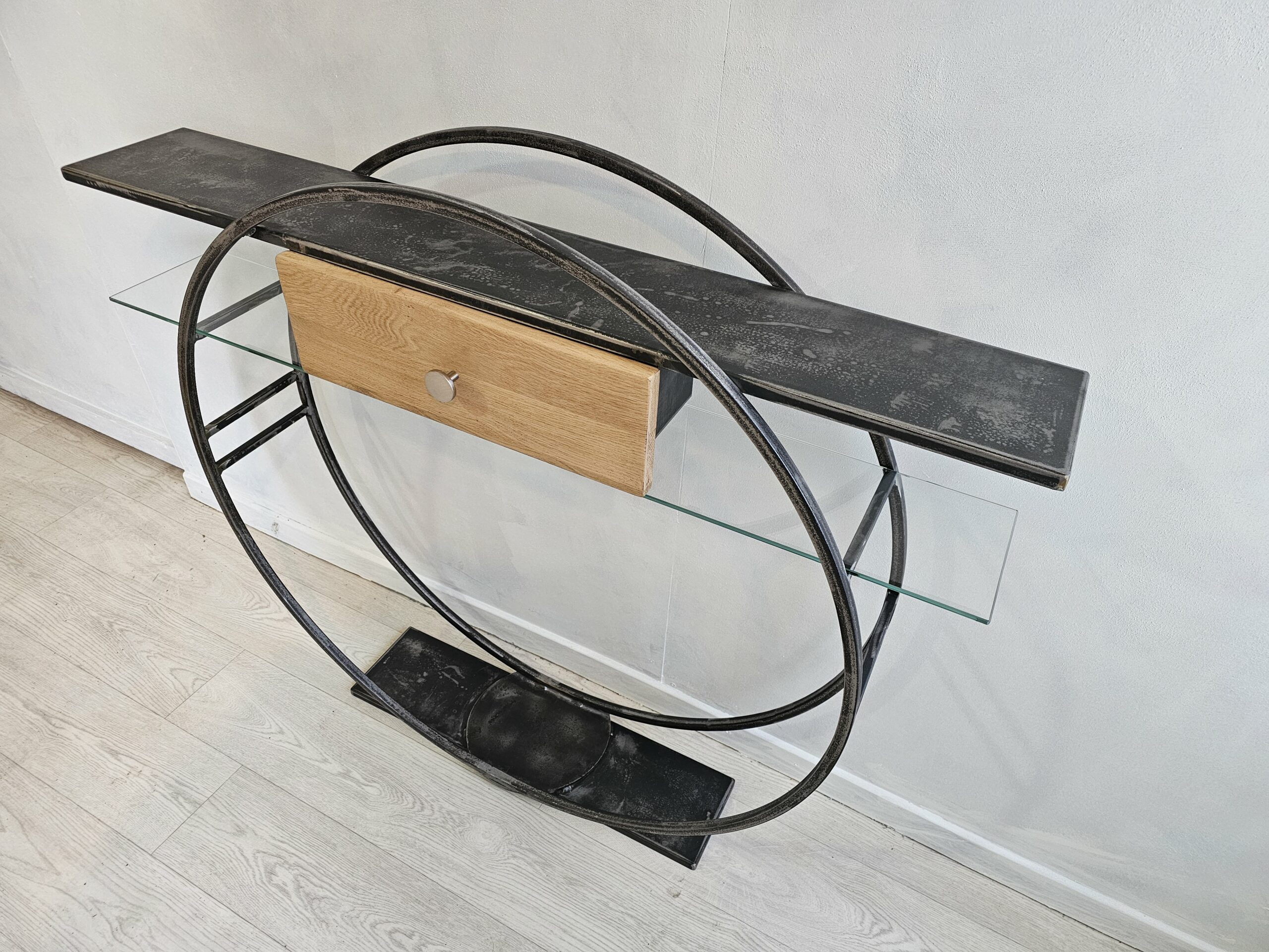 Sublimez votre intérieur avec cette console d’exception, entièrement fabriquée à la main dans notre atelier. Ses deux cercles en métal patiné apportent une touche d’élégance industrielle, tandis que le tiroir discret offre un espace de rangement pratique. Choisissez parmi une large palette de finitions haut de gamme pour créer un meuble qui vous ressemble.