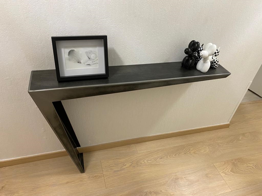 Le travail de la patine confère à la console « NAOS » une originalité et une esthétique moderne, faisant de chaque pièce une création unique. Elle est disponible en plusieurs finitions : noir/argent, acier vibré, et vieille or. Chaque patine, réalisée avec précision, ajoute une touche distincte et raffinée à votre intérieur (voir page Patines dans le menu en bas à gauche).