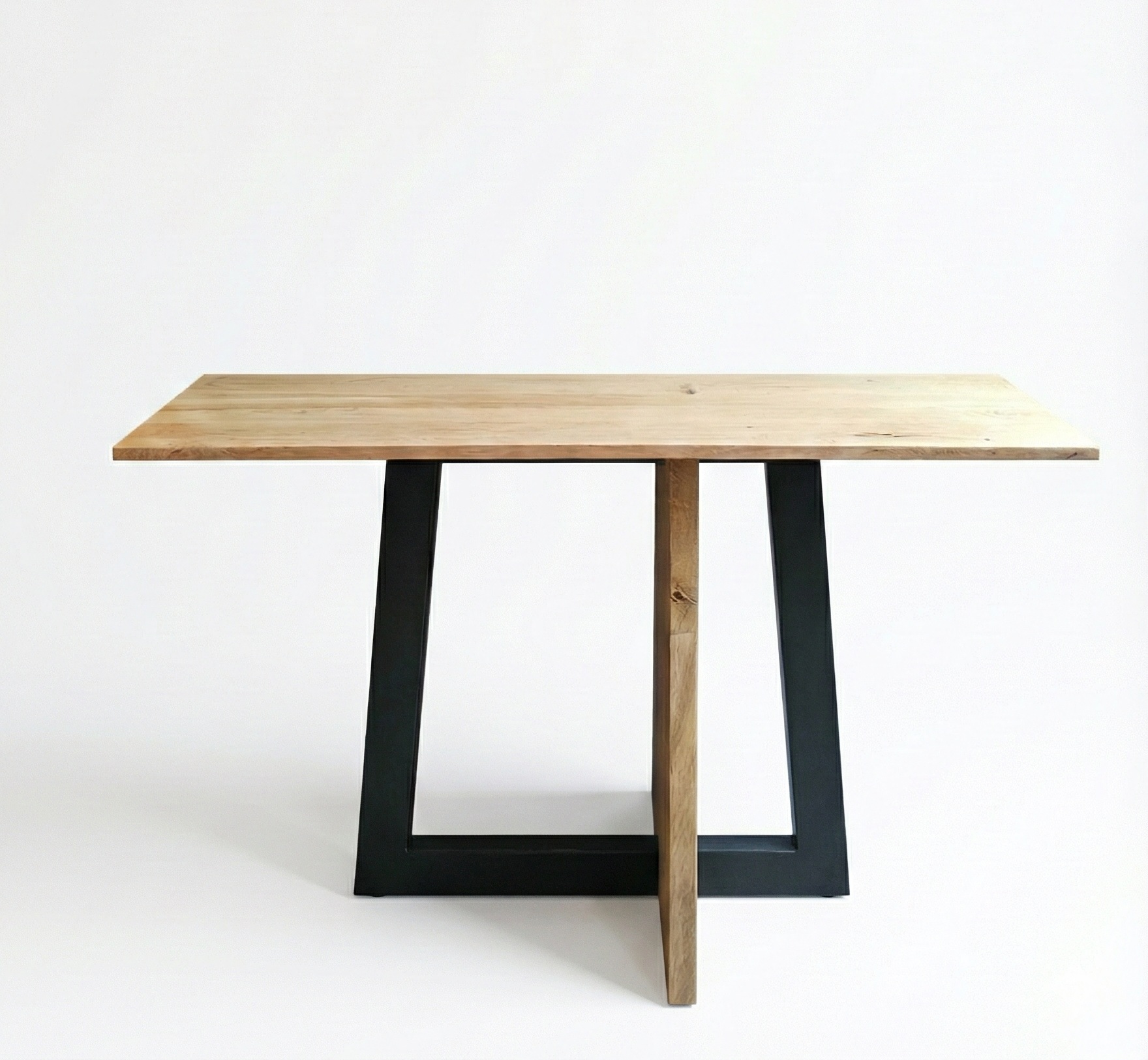 Le support de la console affiche un caractère affirmé. En premier lieu, une partie du piétement utilise du chêne massif de 4 cm d’épaisseur. Cette section robuste apporte une présence boisée unique. Ensuite, la structure métallique se compose d’un tube rectangulaires de 4 x 8 cm.