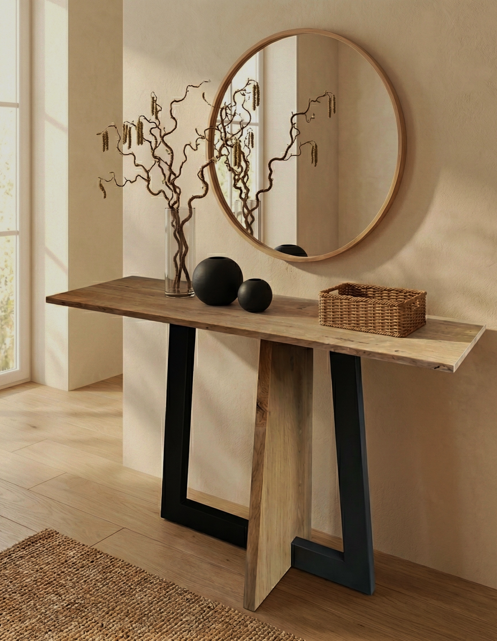 L’accueil chaleureux : Dans l’entrée, elle donne le ton dès le premier regard. Habillez-la d’un vide-poche design, d’un miroir rond et d’une lumière douce pour souhaiter la bienvenue.