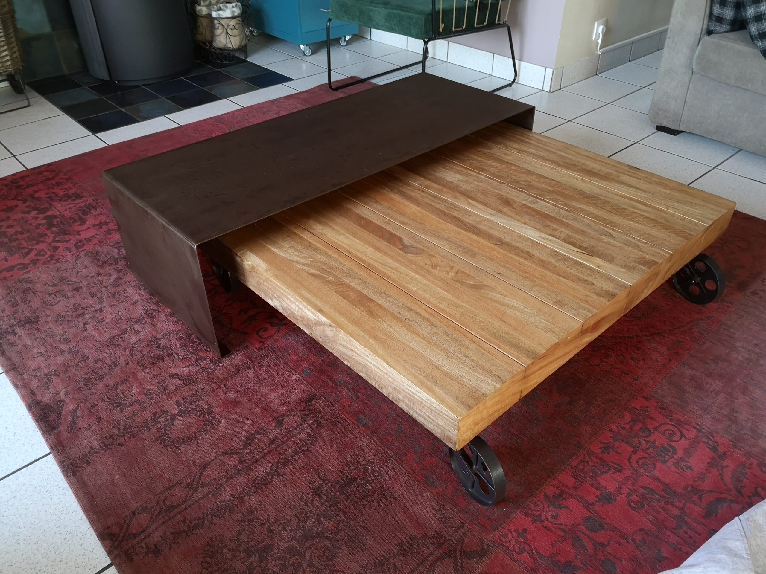 Pour prendre l’apéritif avec vos amis ou jouer avec vos enfant, Douceur Brute vous propose ce Jeux de deux tables basse ; un carré en bois sur roulettes et au dessus un rectangle en métal brut ou patiné –