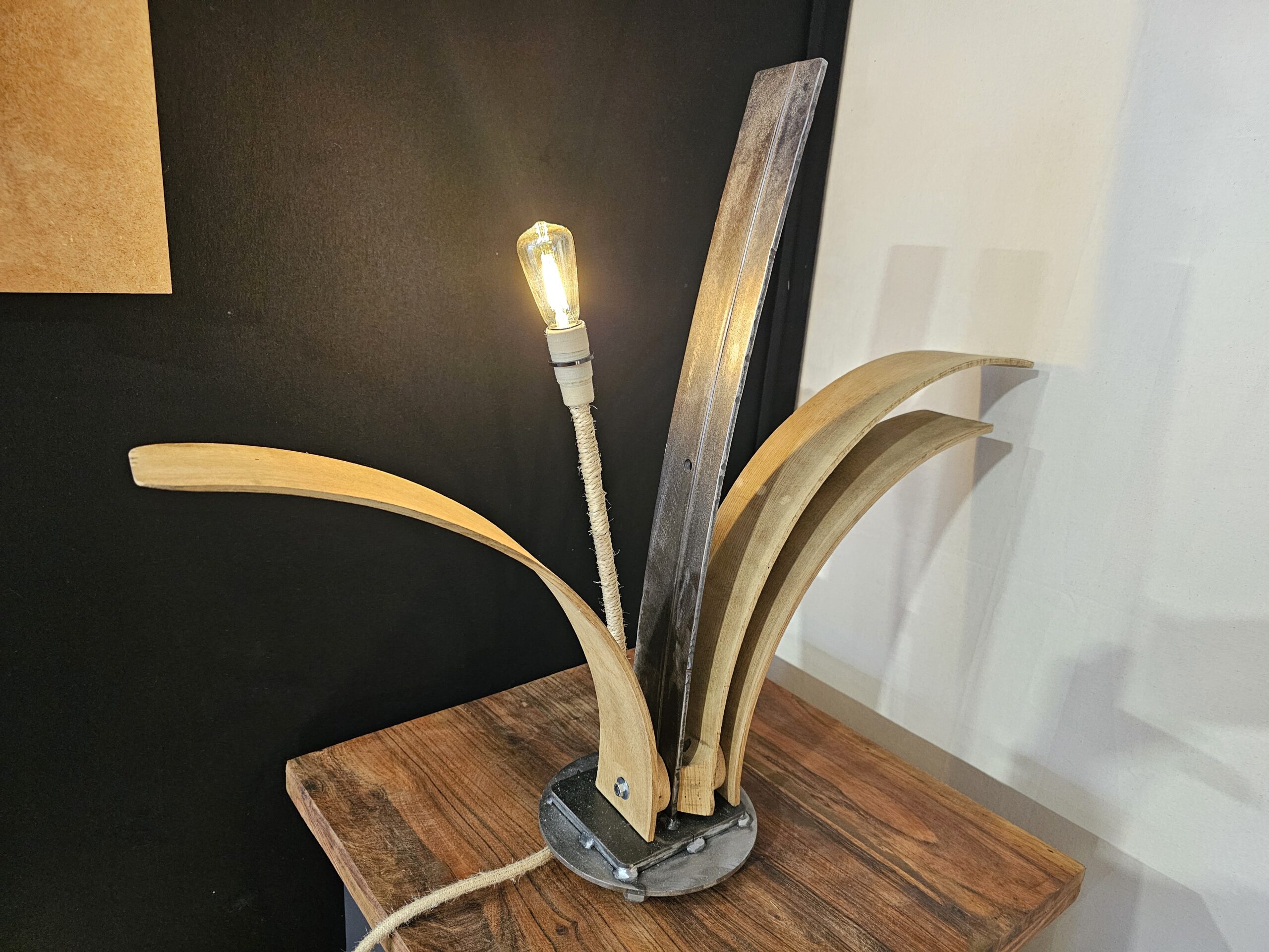 La lampe « Nénuphar » se distingue par son design épuré et élégant, où les matériaux bruts et naturels se marient harmonieusement. Sa base ronde en métal, robuste et stable, contraste avec les feuilles en bois de récupération et sa feuille en acier qui s’épanouissent vers le ciel.