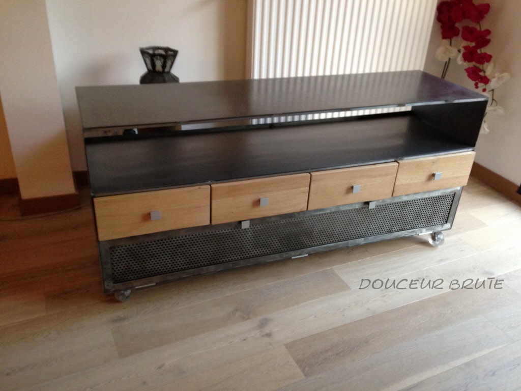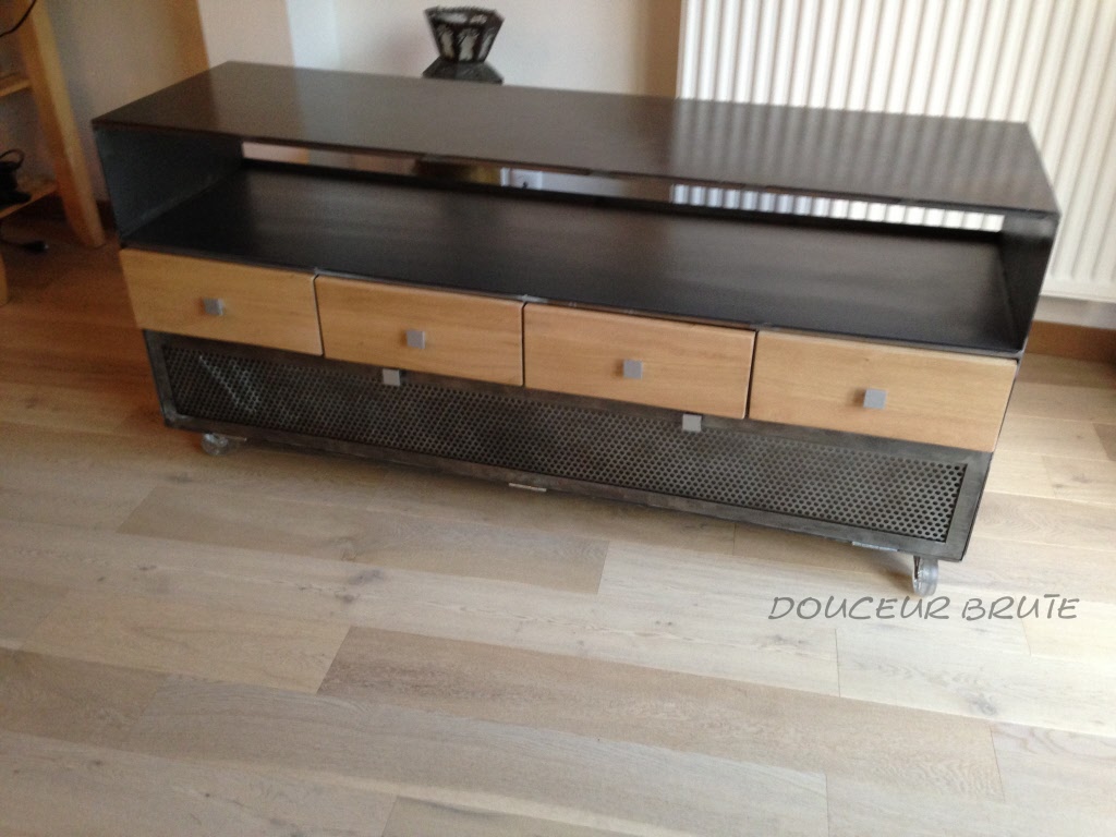 Le meuble TV « LOFT » combine un design industriel avec des matériaux nobles. Fabriqué sur mesure avec du métal gris poli et du chêne clair, il est monté sur roulettes pour une mobilité optimale et dispose de multiples espaces de rangement.