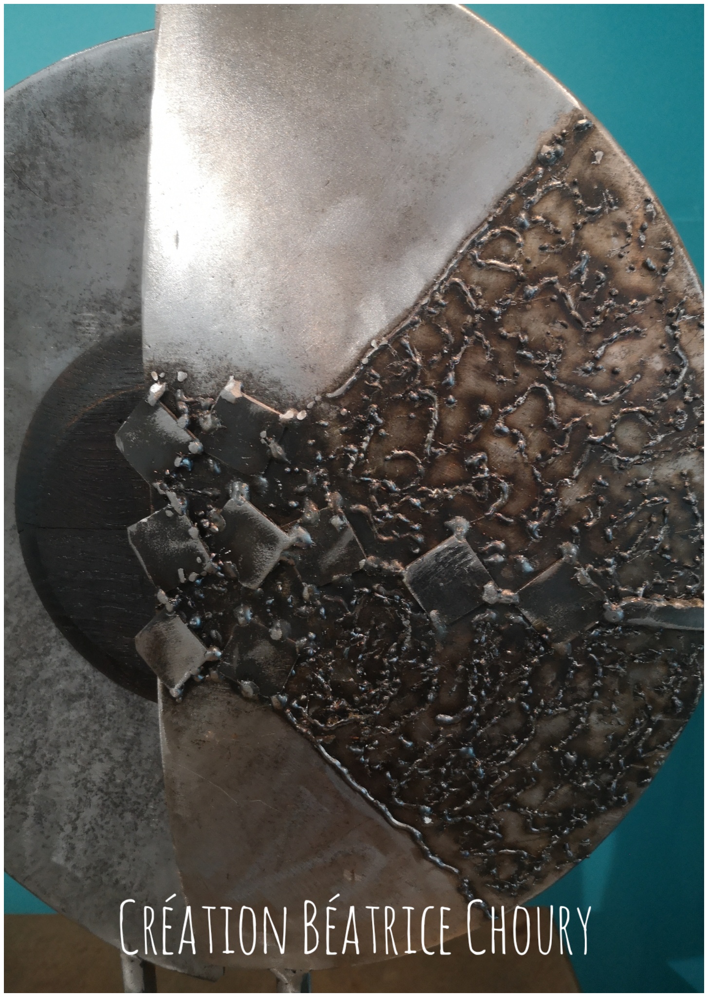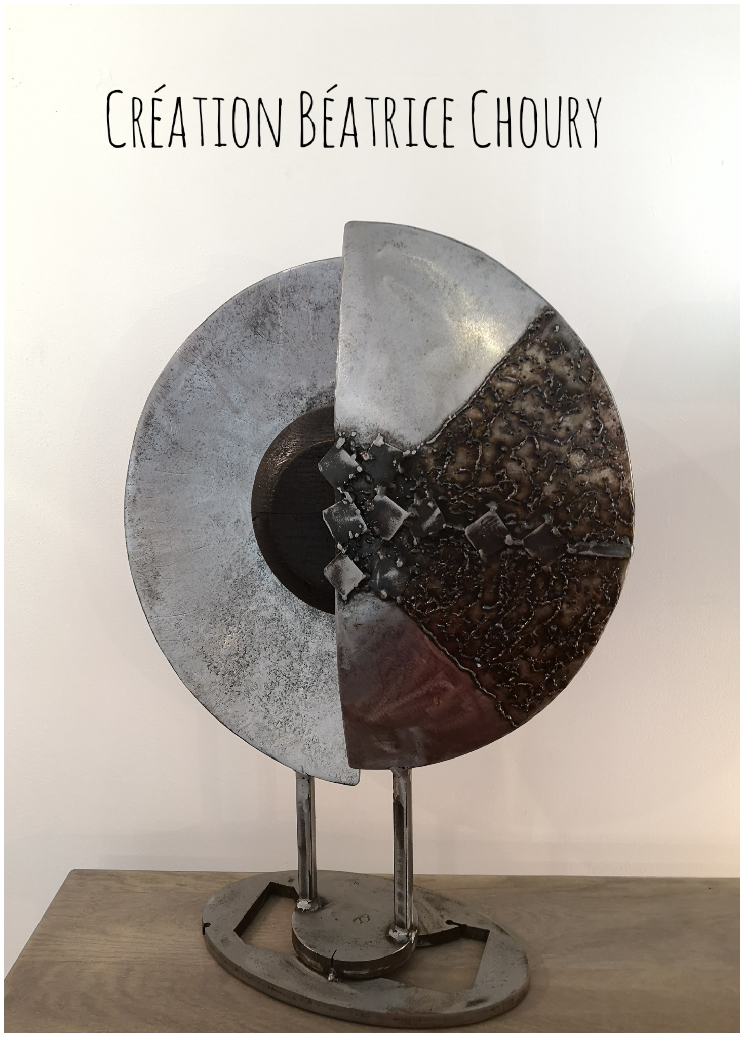 Cette sculpture est le fruit d’une exploration passionnée des contrastes et des complémentarités entre deux matériaux nobles : le métal et le bois massif.