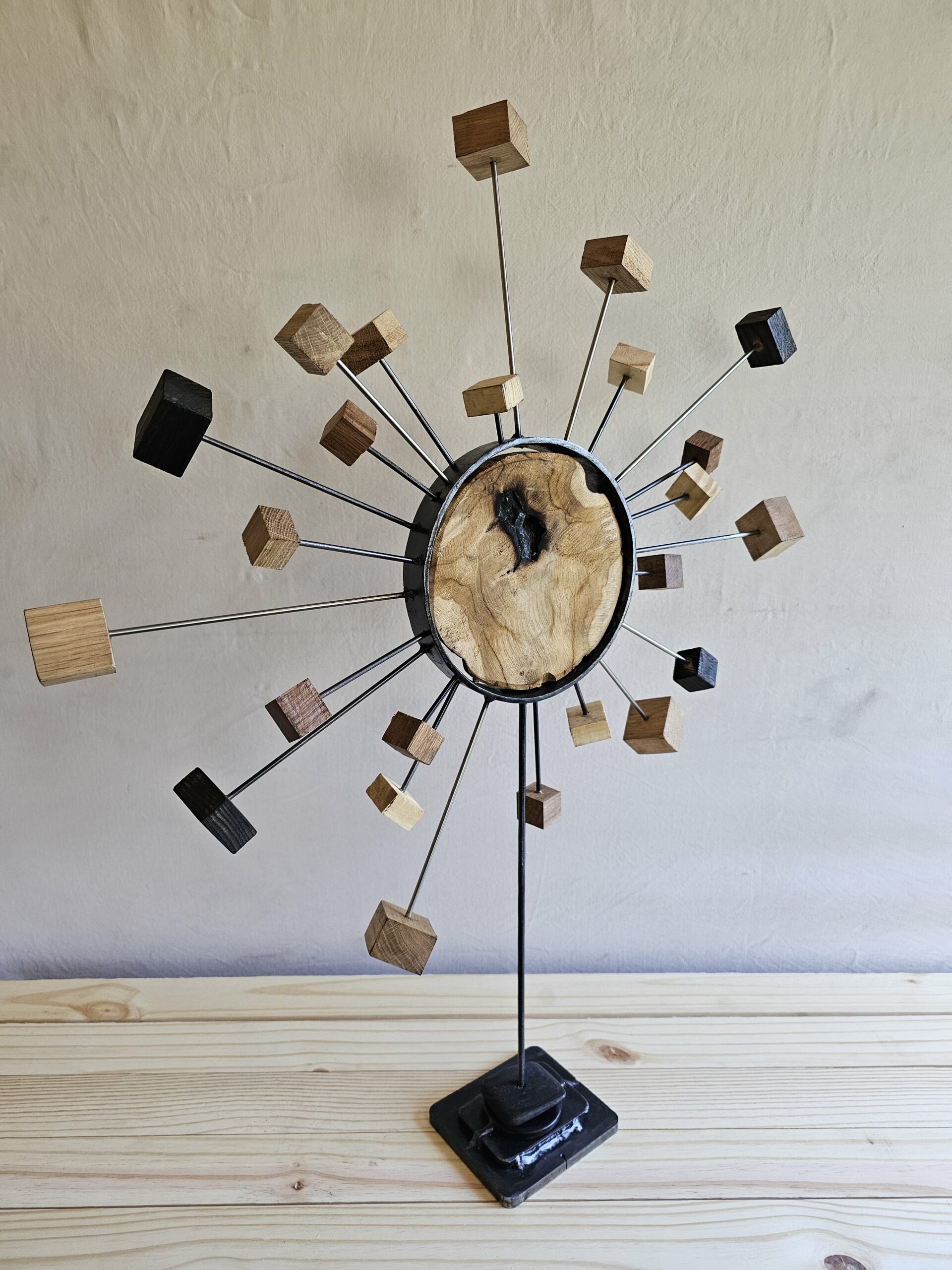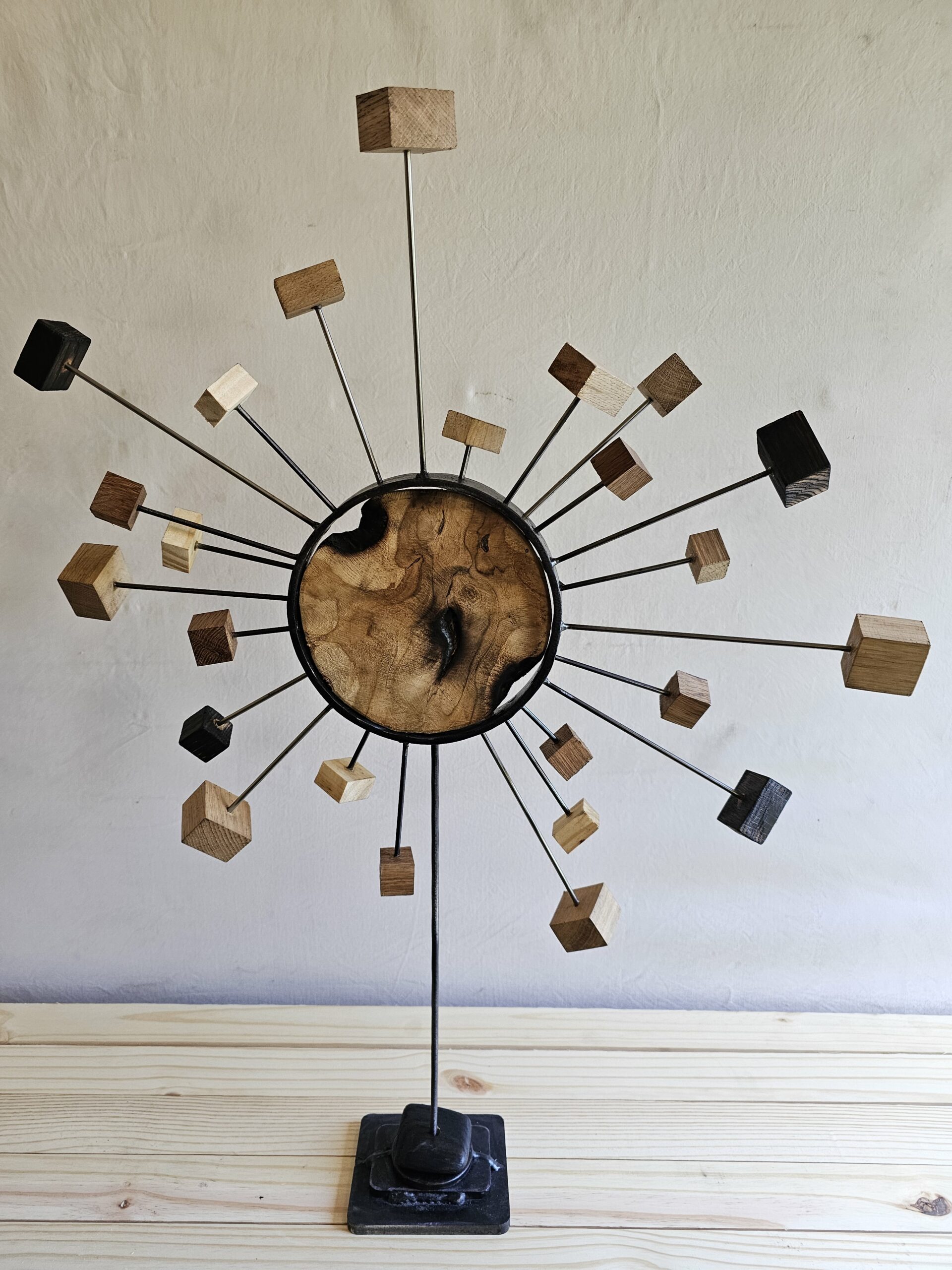 De cette union naissent des tiges d’inox, telles des flèches d’argent, qui s’élancent vers l’infini. À leurs extrémités, de petits cubes de bois, semblables à des lucioles captives, scintillent de leur lumière intérieure. Ces sentinelles de bois et d’acier semblent garder l’entrée d’un monde invisible, un royaume où les rêves et les souvenirs se mêlent à la réalité.