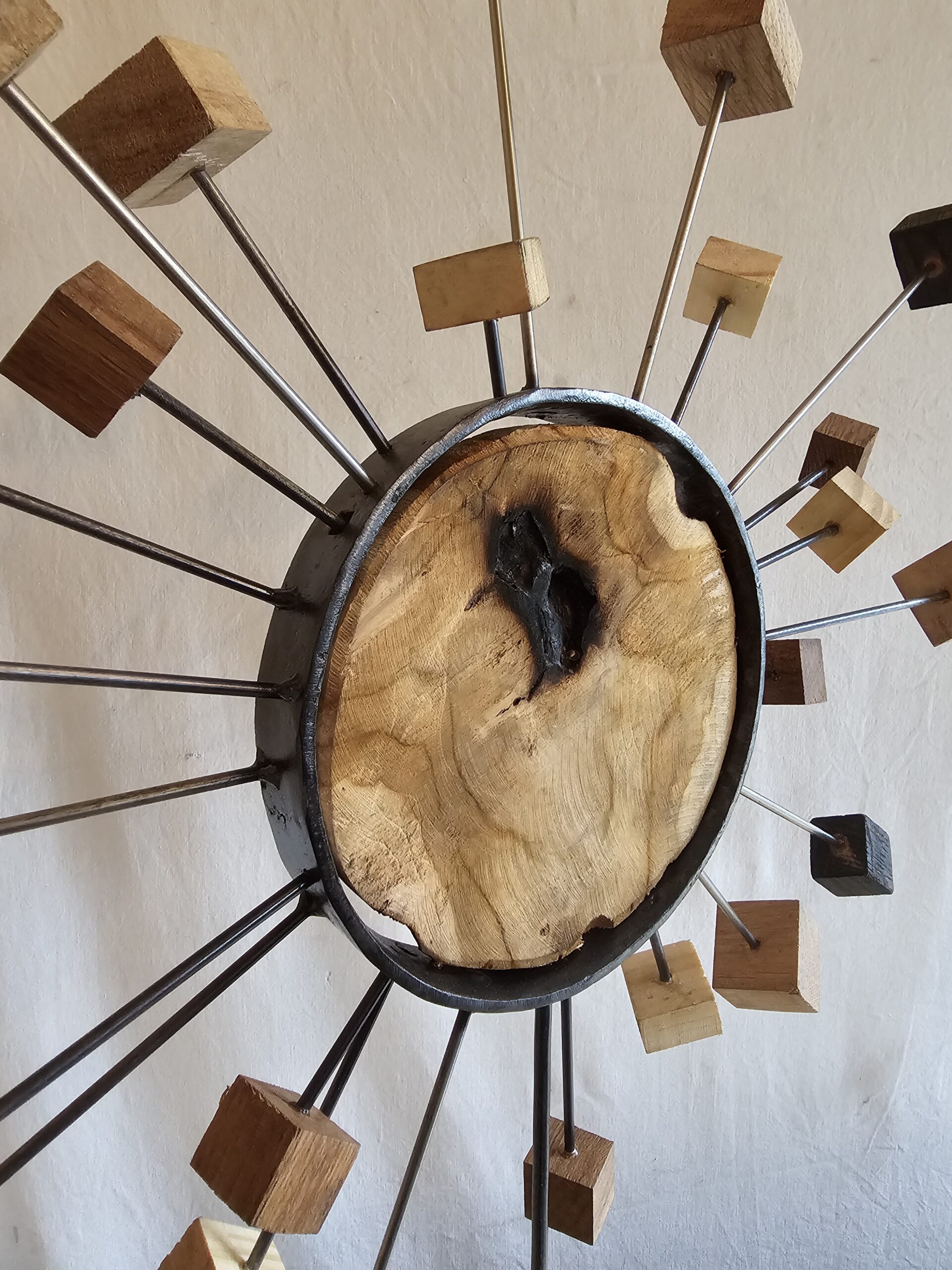 Un cercle de bois, tel un astre solaire, irradie de sa chaleur naturelle. Son grain délicat, témoin des années et des saisons, raconte l’histoire d’une forêt lointaine, un sanctuaire de sagesse et de sérénité. Autour de ce noyau vivant, un anneau de métal déploie son éclat argenté, une aura de modernité et de puissance. Ce contraste saisissant crée une harmonie parfaite, un équilibre entre la force brute de la nature et la précision de l’art humain.