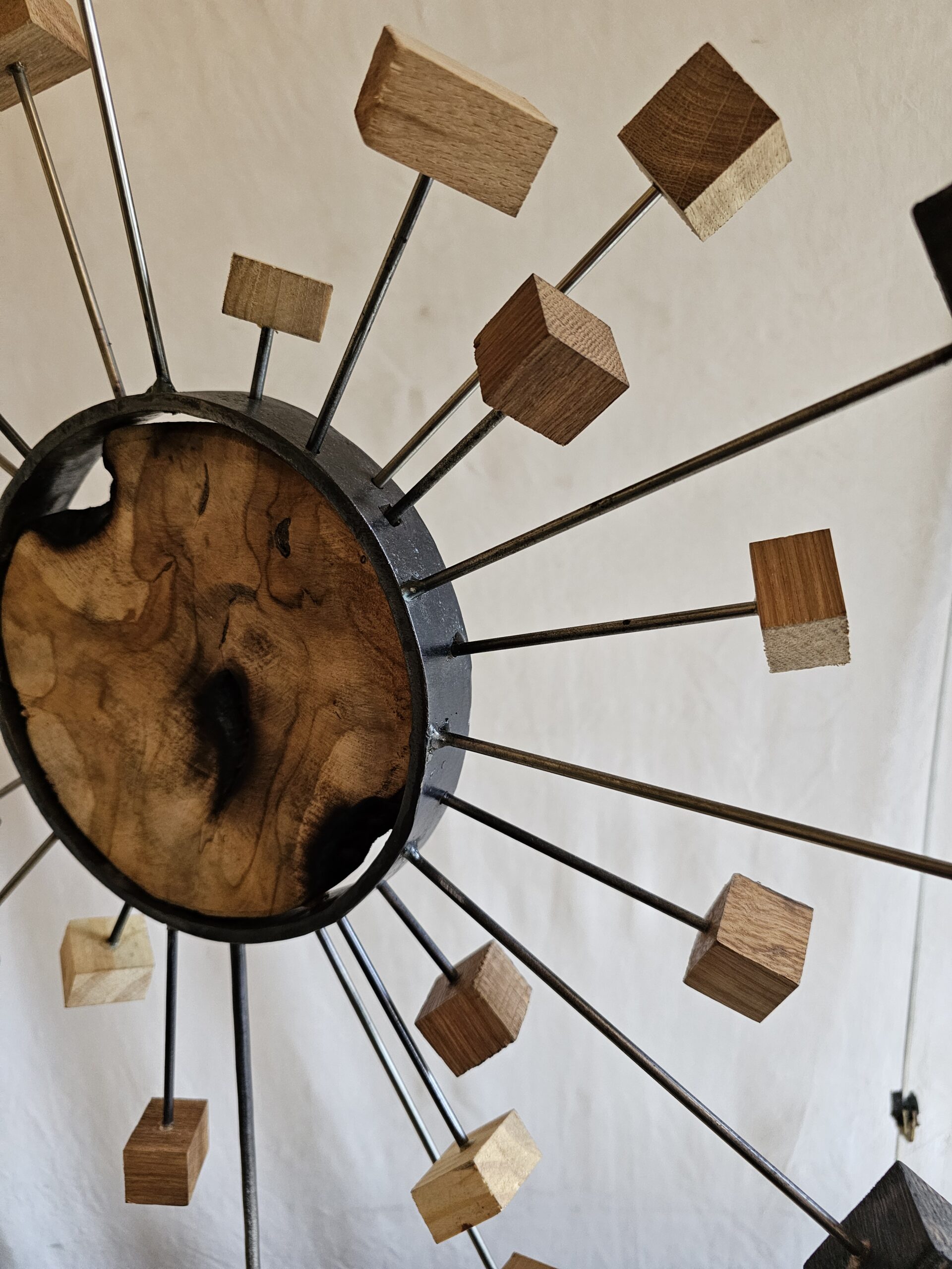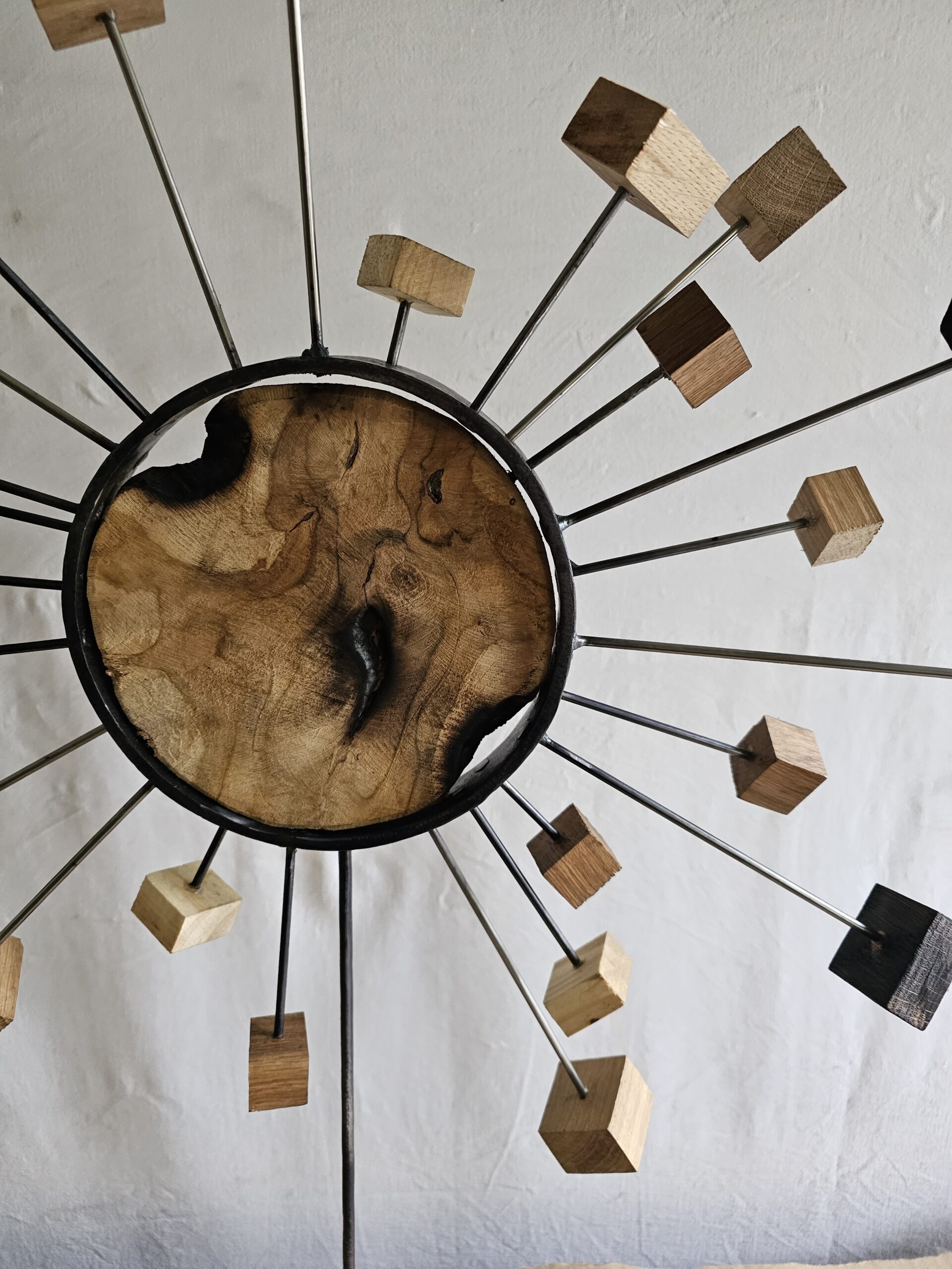 - Matériaux : Rond de bois massif teck, cercle de métal, tiges en inox, cubes de chêne massif